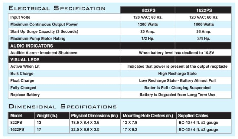 When the grid power goes out, the 1622PS automatically converts energy from the battery into power for your pump, refrigerator, or other 120v loads. When your power returns, the 1622PS automatically switches back to the grid, and charges your batteries until they are at their full capacity.